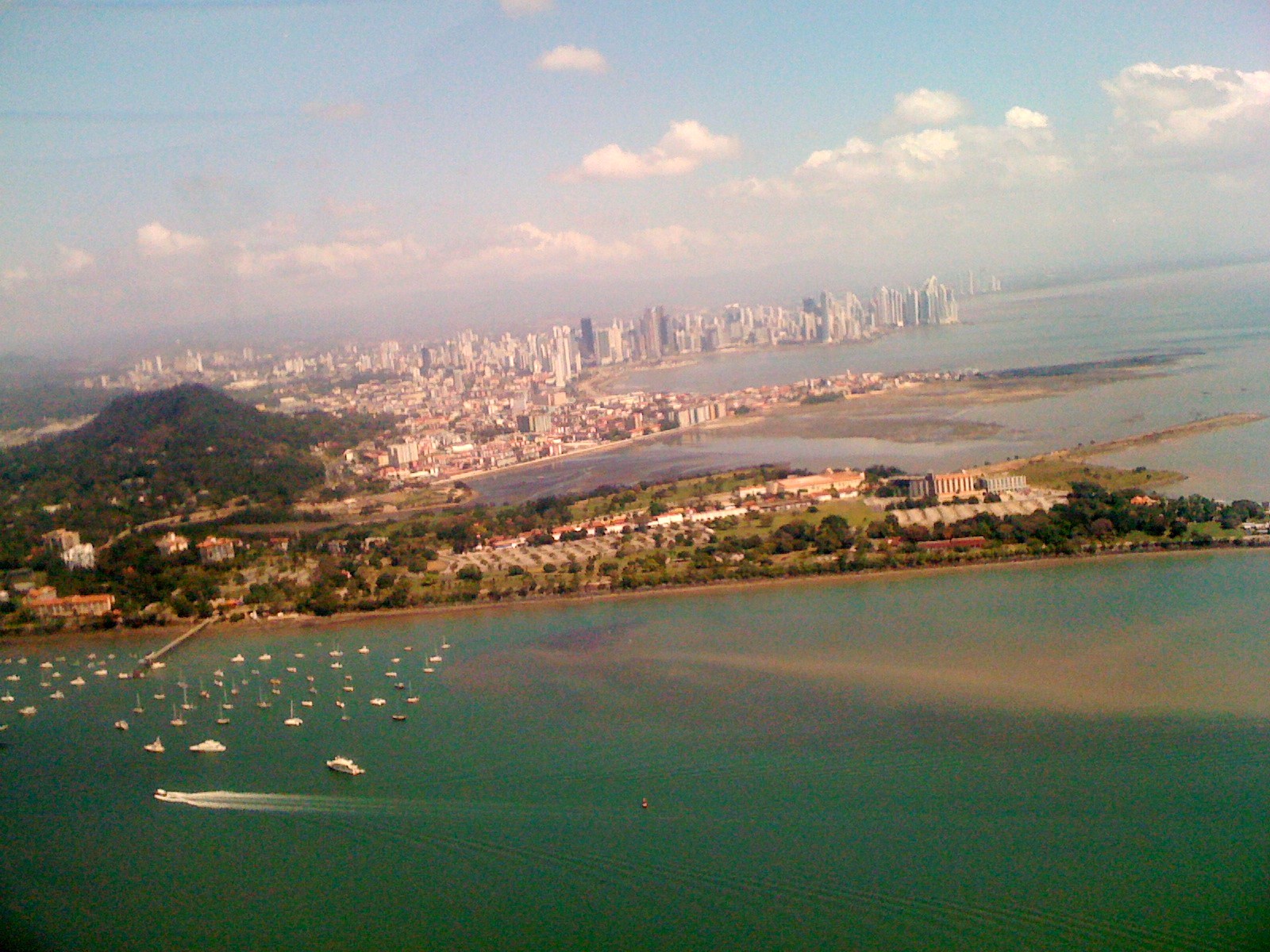 Links passieren wir Panama Pacifico, ein früherer US-Militärflughafen (Howard AFB) zum Schutz des Kanals, jetzt eine Sonderwirtschaftszone, wo Dell, 3M, Caterpillar und andere große Unternehmen produzieren oder ihre Lateinamerika-Zentrale betreiben. Dann kommt die Stadt aus dem Dunst in Sicht, beeindruckend. Eine Unmenge von Wolkenkratzern: weit mehr als 200 Gebäude, die mehr als 30 Stockwerke haben. Das höchste, mit 70 Geschossen und 284 m ist seit kurzem der Trump Ocean Tower. Es ist zugleich auch das höchste Gebäude Lateinamerikas. Dessen Ocean Club liegt 80 km südlich im Pazifik, auf der Las Perlas Inselgruppe.