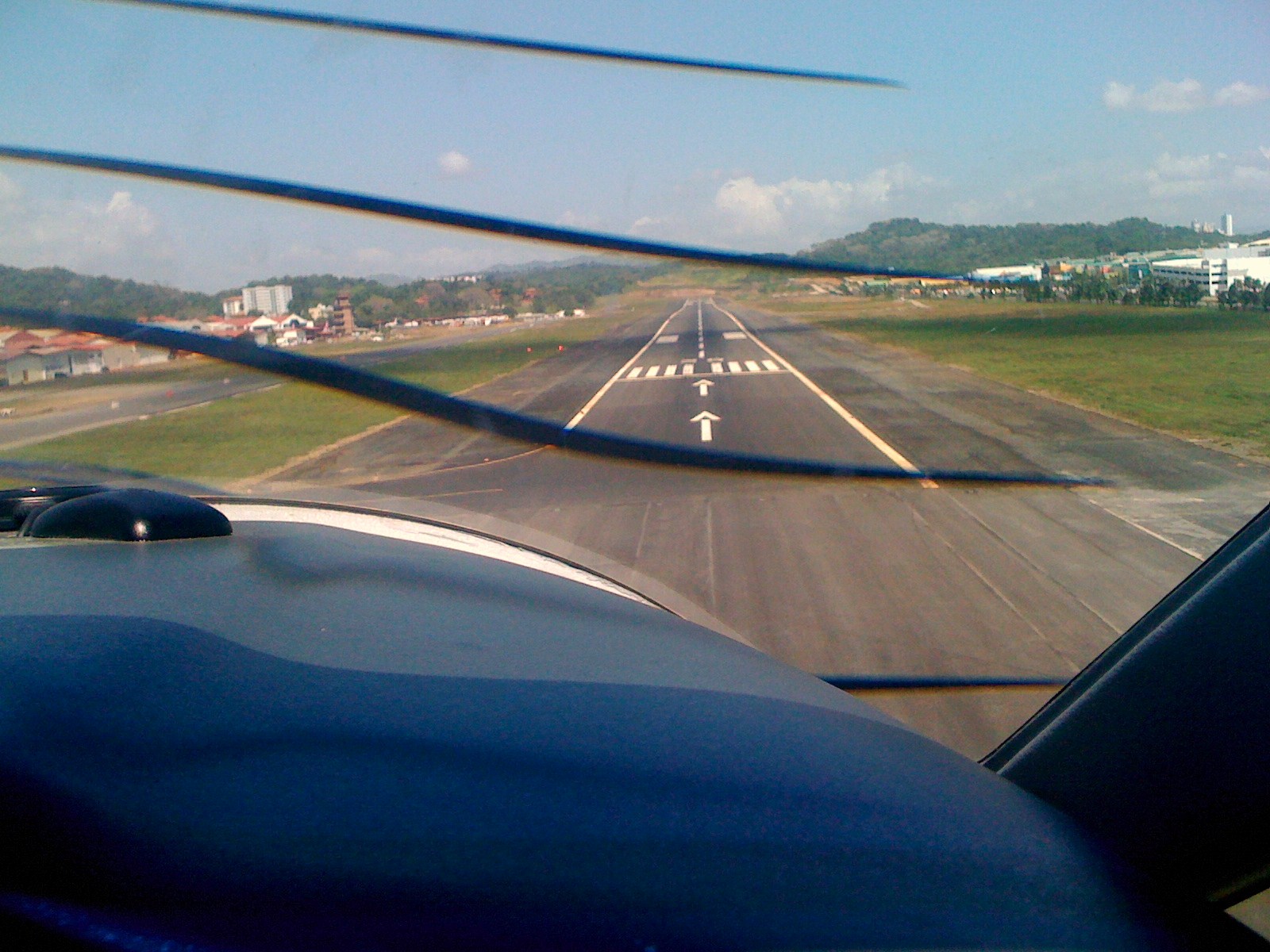 Wir sind nur noch 5 nautische Meilen vom Flugplatz entfernt und wechseln die Sprechfrequenz von Panama Control zum Tower Gelabert. Direkt zur Piste 36, mit 12 Knoten Wind aus 330 Grad. Wir sind Nummer 1 im Anflug, hinter uns kommt eine Cessna von der Insel Contadora und bestätigt nach Kommunikation mit dem Tower „cleared to land“. Kaum möglich, weil ich ja vor ihr fliege. Und schon kommt der Tower zurück: “ Sie haben KEINE Landeerlaubnis, sondern sind Nummer 2″. Peinlich für meinen Kollegen da hinten. Stattdessen wird für HP-1708 jetzt die Freigabe zur Landung erteilt und von mir zur Bestätigung wiederholt.