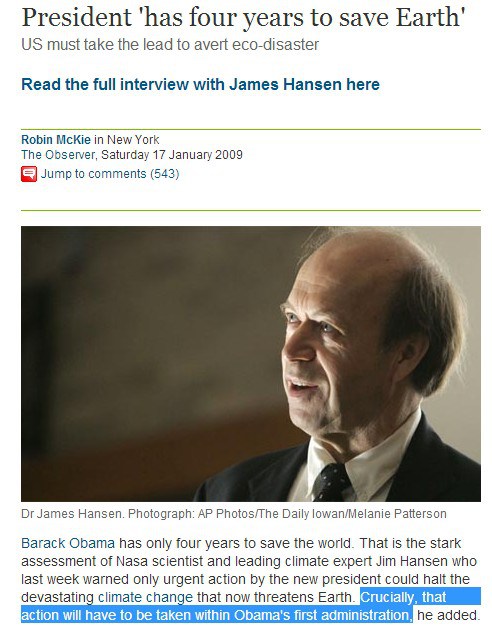 2. Die CO2 Emissionen der industrialisierten Welt werden einen Klimawandel auslösen, der das Leben auf der Erde gefährdet. Eine Theorie, die in Deutschland inzwischen mainstream ist. Einer der führenden Protagonisten, der NASA Wissenschaftler James Hansen, hat vor Obama’s erster Amtszeit verkündet, dass der President genau 4 Jahre hätte, die Erde zu retten.