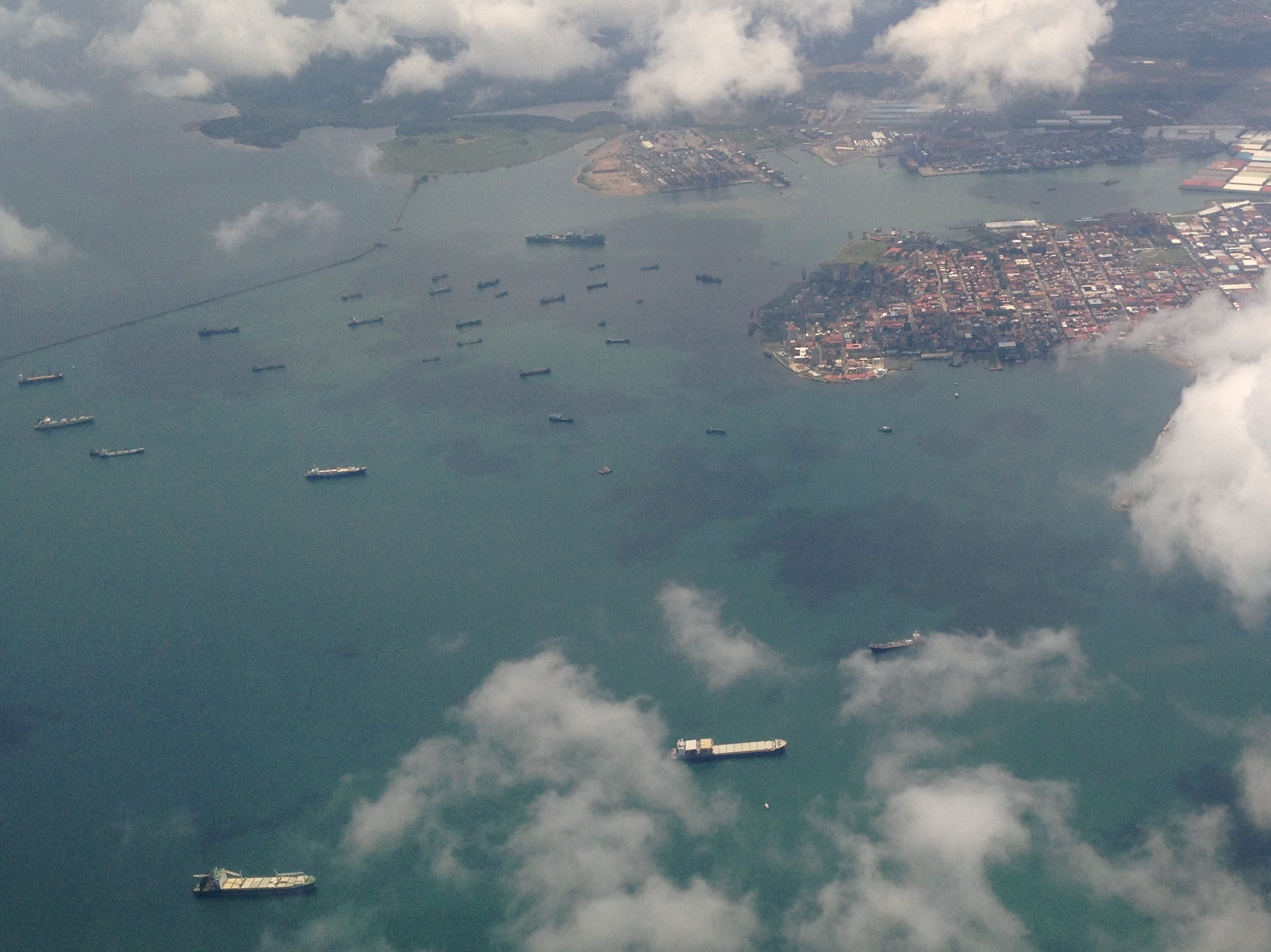 Zuerst über Bergland, und dann sehen wir schon die ausgedehnte und zerfranste Wasserfläche des Lake Gatun. Sieht nicht so aus, ist aber ein künstlich aufgestauter See und liegt 26 Meter über Meeresspiegel, Bestandteil des Panamakanals.