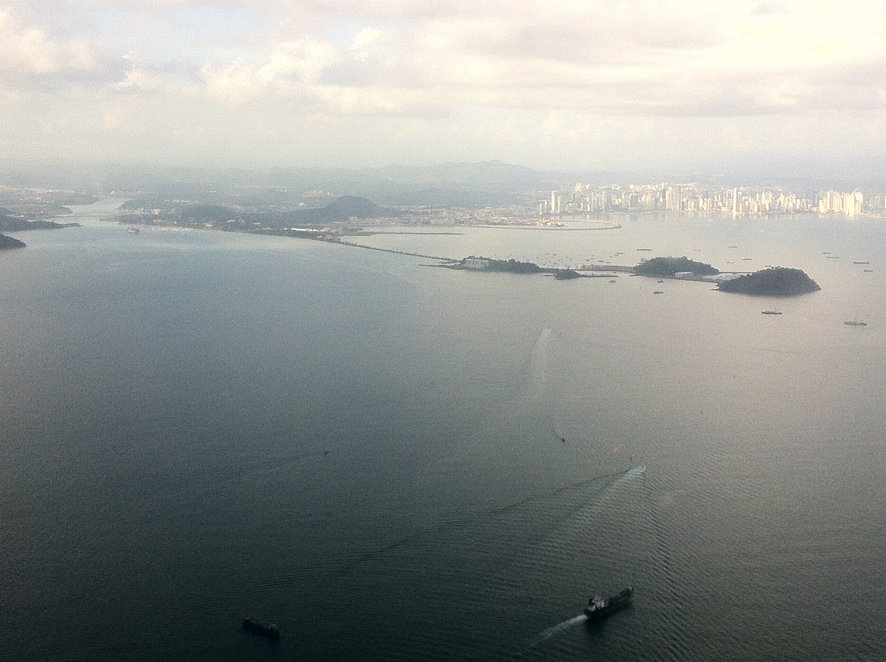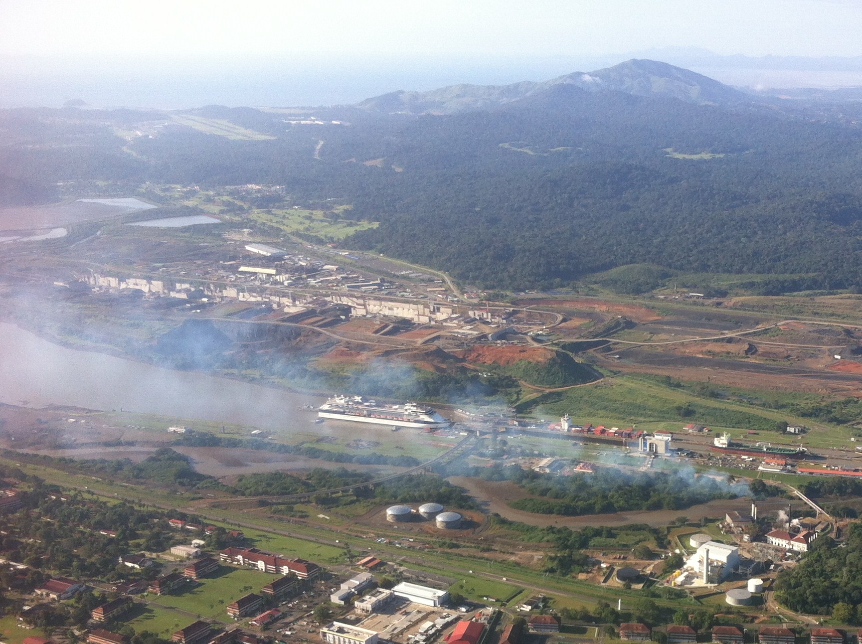 Frühstück, Taxi zum Flugplatz und Abflug nach Chame. Beim Überfliegen des Panamakanals sehen wir die Celebrity Infinity nochmal von oben, vor der Einfahrt zur Miraflores-Schleuse. Dahinter kann man gut die Baustelle der neuen Schleusen erkennen.