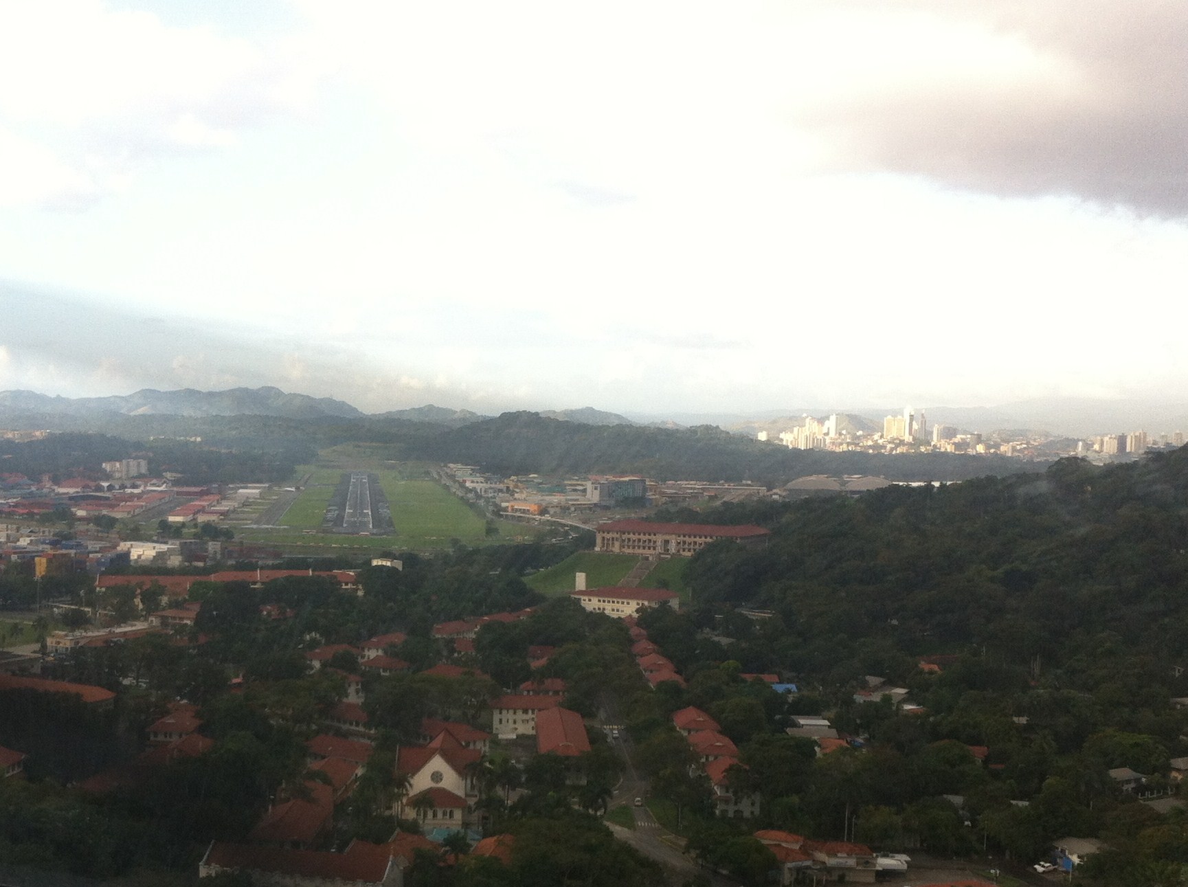 Jetzt ist aber Zeit nach Hause zu fliegen. In unserer Richtung haben sich große Wolken aufgetürmt. Wir nehmen erstmal Kurs Panama City und auf halber Strecke bekommen wir die Information, dass an unserem eigentlichen Ziel Chame schwerer Regen niedergeht. Das war’s dann für heute. Auch nach Rio Hato müssten wir durch das Unwettergebiet, keine Option. Also bleibt nur der Marcus A. Gelabert Flugplatz (MPMG) im Nordwesten der Hauptstadt. Wir schweben über die Brücke der Amerikas ein, mit Blick auf Downtown Panama City.