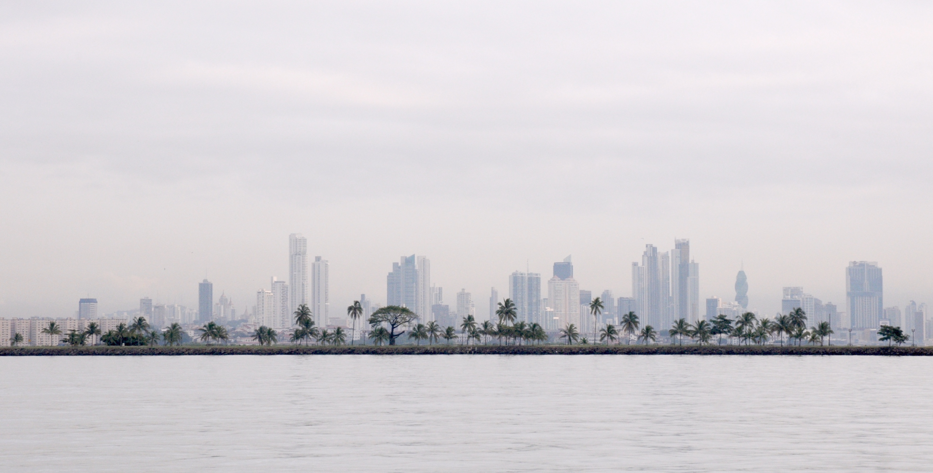 Dieses Bild eines trüben Tages ist vom Schiff in der Pazifikeinfahrt des Panamakanals geschossen und schaut über den Amador Causeway auf die Skyline der Stadt.