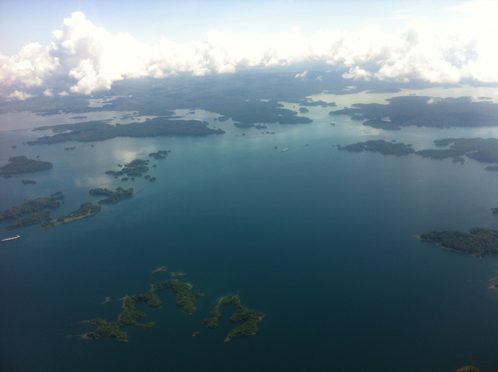 Wir starten in Chame (MP24), nur wenige Kilometer von der Pazifikküste entfernt. Kurs Nord und steigen auf 5500 Fuß. Wir überfliegen dabei den Lake Gatun, durch den ja ein großer Teil des Panamakanal verläuft. Von oben kann man gut die Schiffe sehen und dann die Gatunschleuse. Die alte und seit 100 Jahren in Betrieb befindlich, darüber die Baustelle der Erweiterung mit neuen großen Schleusentoren.