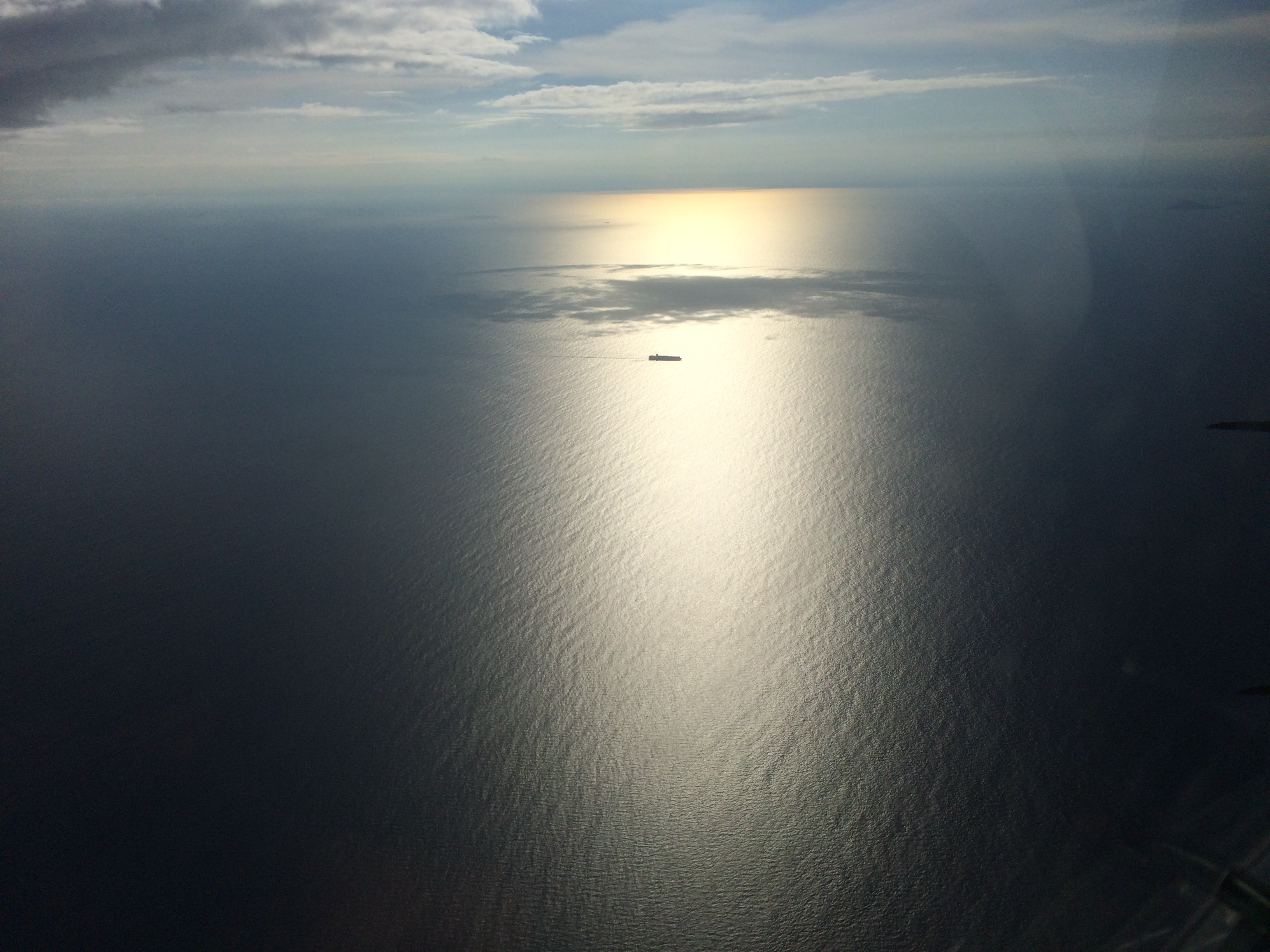 Fertigmachen für die letzte Etappe: 50 Seemeilen auf 4.500 Fuß zurück nach Chame. Es geht nach Westen, der untergehenden Sonne entgegen, ein vollbeladenes Containerschiff auf dem Weg zum Kanal und im Sinkflug noch ein Bild von Punta Chame.