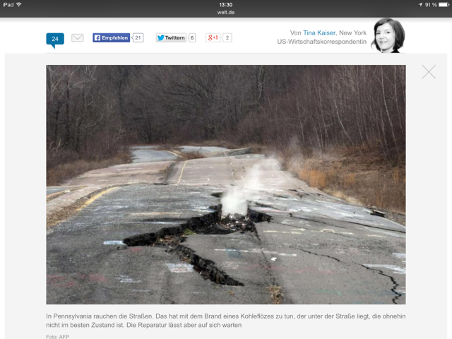 Eine aufgegebene Straße in Pennsylvania unter der seit Jahrzehnten ein Kohleflöz brennt: