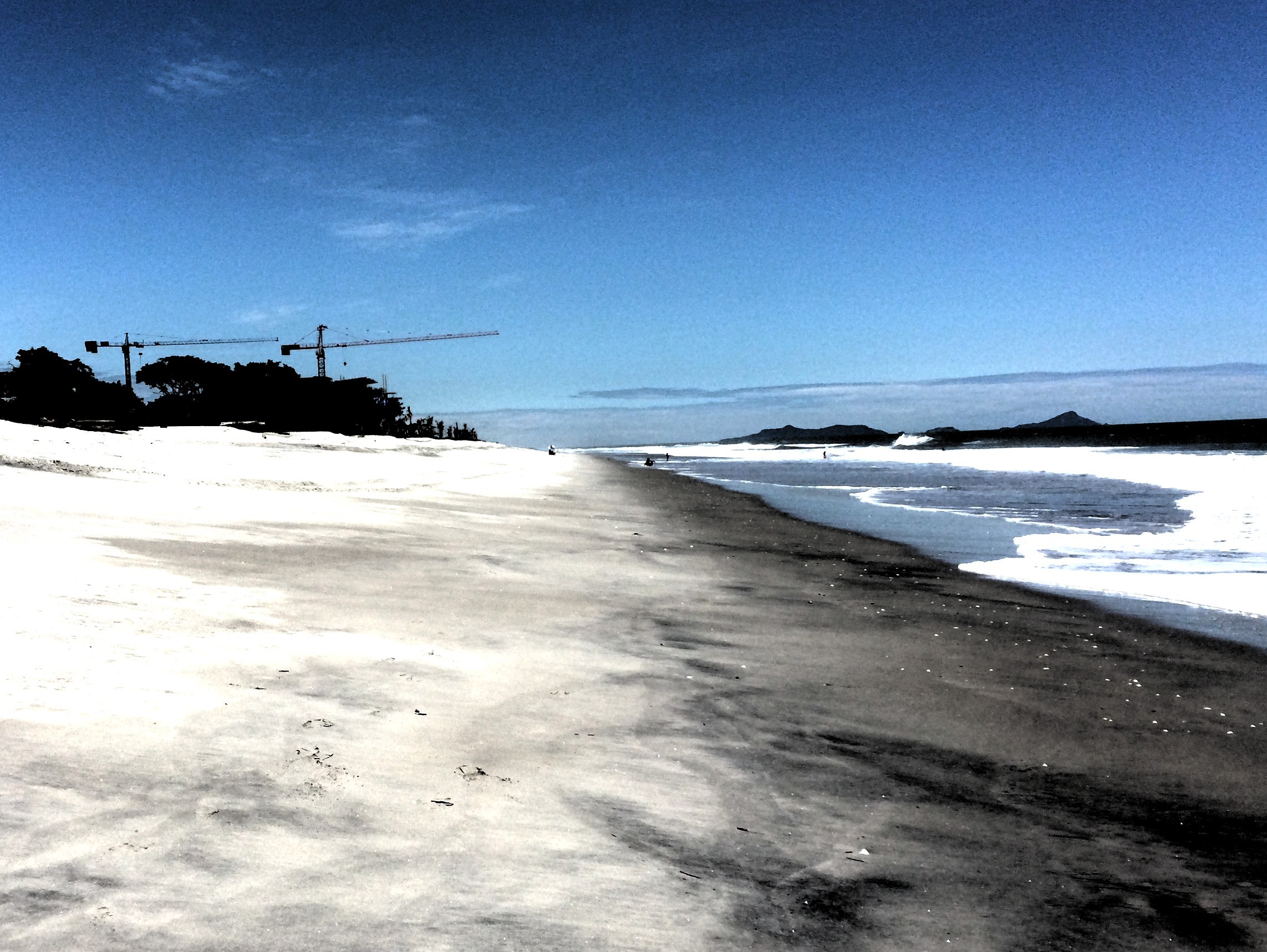 Die Kräne im Bild errichten gerade die ersten zwei Apartmenthäuser direkt am Strand. Das werden noch mehr, dazu 30 Grundstücke mit Häusern und eine Hotelanlage. 20 km weg von der Pan-Americana, nichts zu hören ausser Wellen und Vögeln.