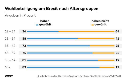 Wie so oft muss man bei Statistiken aber etwas genauer hinschauen. In der o.g. Altersklasse haben nämlich nur 36% der Wahlberechtigten gewählt, was den Anteil der Stay-Stimmen in ihrer Altersgruppe auf 26,3% reduziert. Sieht nicht wie eine satte Mehrheit aus, oder? (Quelle: Sky Data)