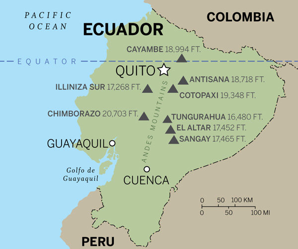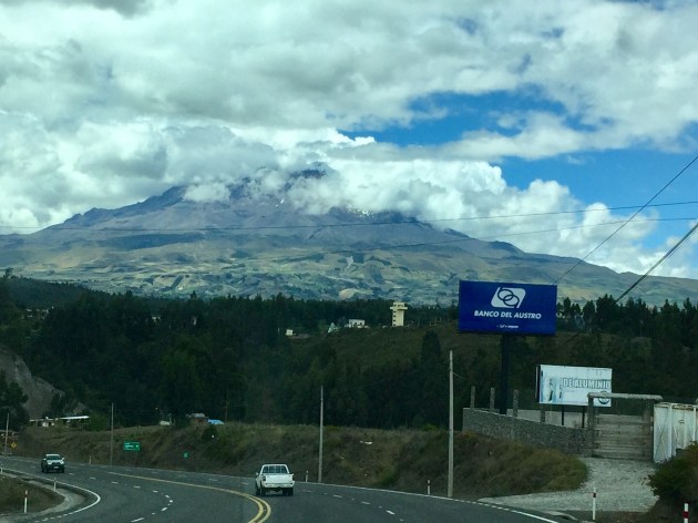 Den Cayambe haben wir vom Äquatormonument aus gesehen. Am Fuß des Antisana haben wir in den Thermalquellen gebadet, den Chimborazo haben wir auf dem Weg von und nach Riobamba gesehen, dem Tungurahua sind wir bis auf 8 km nahe gekommen. Der Cotopaxi hat sich all die Tage versteckt, für El Altar und Sangay hatten wir leider keine Zeit, aber dafür haben wir ja den Quilotoa Kratersee besucht. Alles gut.