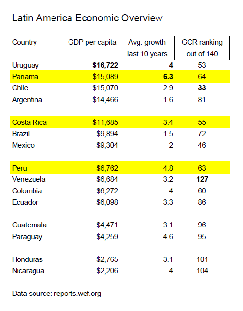 Nichtsdestotrotz sind einige Statistiken des Reports nützlich und daraus mache ich mal ein eigenes Ranking: die lateinamerikanischen Staaten bezüglich Bruttosozialprodukt pro Kopf und durchschnittliches Wirtschaftswachstum der letzten 10 Jahre. Dazu noch die Platzierung in der Wettbewerbsfähigkeit.