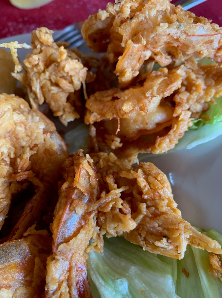 Die Garnelen sind derart frittiert, dass man die Schalen beinahe mitessen kann, das Fleisch jedoch immer noch saftig und schmackhaft ist.