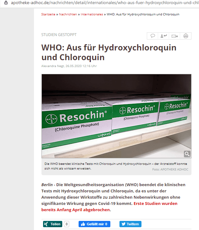 Ungeachtet desssen wurden in aller Welt Testreihen gestartet, bis vor einigen Tagen im ehemals renommierten Fachjournal Lancet eine umfassende Studie erschien, die wiederum vor dem Einsatz von Hydroxy/Chloroquin warnt, dieses Mal also auf wissenschaftlicher Basis.