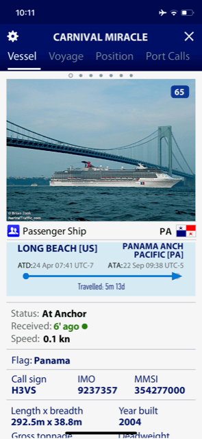 Nach 6 Monaten vor Anker hat sich soeben die CARNIVAL MIRACLE auf den Weg gemacht. Die noch größere CARNIVAL PANORAMA und die STAR PRINCESS liegen noch vor der Pazifik-Einfahrt des Panama-Kanals.