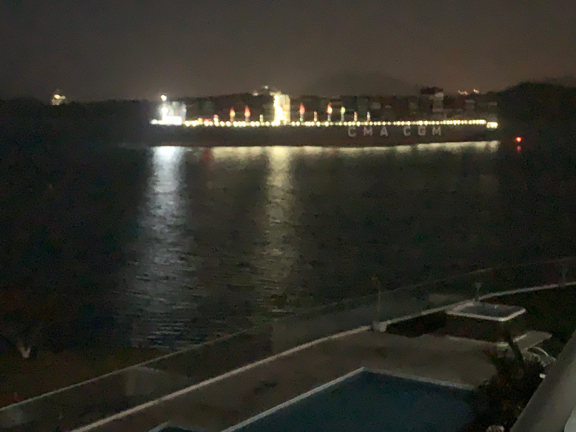 Das, was da gerade in einer Vollmondnacht hier vorbeituckert, ist die CMA CGM „Argentina“ auf ihrem Weg von Savannah (USA) nach Qingdao, China.