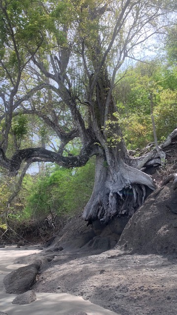 Am rechten Rand der Bucht kommt ein derzeit trockenes Flussbett aus dem Dickicht, alte knorrige Bäume überall.