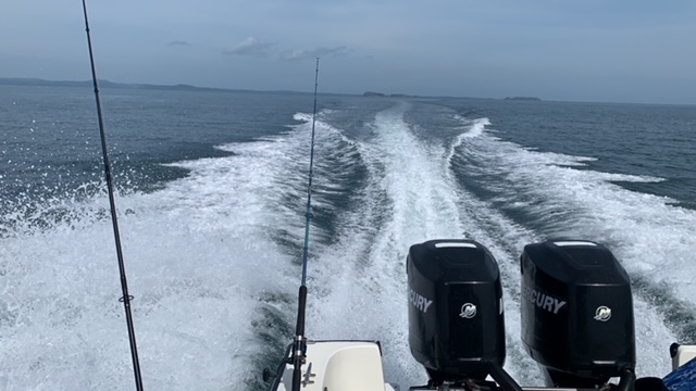Es war ein guter Tag: der Himmel war zart verschleiert, so dass die Sonne nicht mit voller Kraft auf uns hernieder prasselte. Das Meer machte seinem Namen alle Ehre, der Stille Ozean. Und unser Boot lief durchgängig mit 27,5 Knoten, was 50 km/h sind.