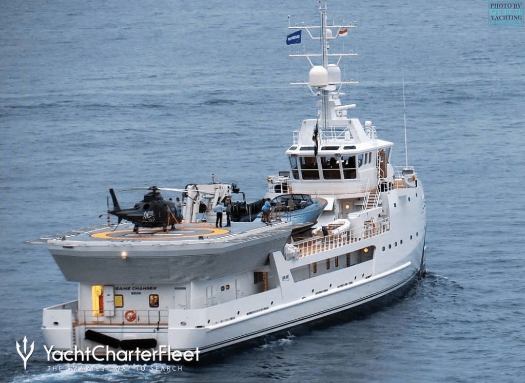 Seit 2 Tagen liegt die Game Changer wenige hundert Meter vor uns vor Anker. Sieht aus, wie eine Luxusyacht, ist aber als Versorgungsschiff klassifiziert. Hochseetüchtig, geräumig, mit einem Speedboot auf Deck und Schlauchboot unter Deck, und natürlich mit Helicopter. Kann man saisonweise ab €450.000 für bis zu 11 Gäste buchen und es steht dann eine 15-köpfige Crew bereit. Nicht schlecht.