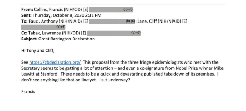 Der Direktor des Nationalen Gesundheitsinstituts (NIH) schreibt u.a. an Dr. Fauchi: