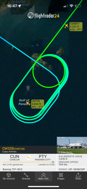 Heute kam, genau zur Stoßzeit, ein schweres Gewitter in Panama City auf und es war interessant zu sehen, dass fast alle anfliegenden Maschinen irgenwo eine oder mehrere Warteschleifen fliegen mussten.