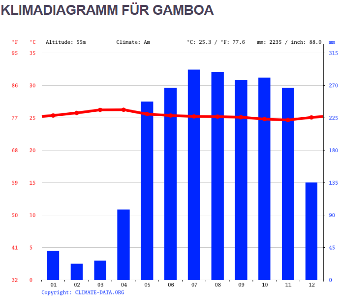 Aber der Vergleich soll ja eher den Regionen innerhalb von Panama gelten. Deshalb der Blick auf Gamboa, was repräsentativ für die Haupstadt ist: Jahresdurchschnittstemperatur mit 25°C immerhin 6°C höher als in Boquete. Die Niederschläge liegen im Sommer bei 270 mm statt um 420 mm in Boquete.