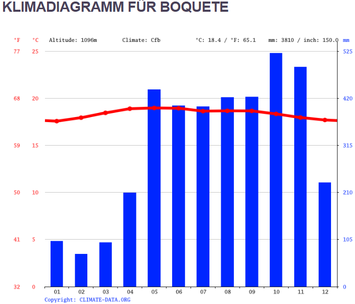 Die Jahresdurchschnittstemperatur für Boquete ist so wie Berlin im Sommer, 18 bis 19°C. Flanieren und Eis schlecken das ganze Jahr über? Könnte man sagen, nur dass man in Boquete zwischen Mai und November seinen Regenschirm parat haben sollte. Es gibt fünfmal so viel Niederschlag, wie im Berliner Jahresdurchschnitt.