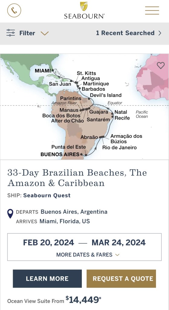 Die Seabourn Quest verfügt über 229 Suites, alle mit Meerblick, und wird der Ultra-Luxusklasse zugerechnet. Hier ist schon mal ein Reisevorschlag für 2024: