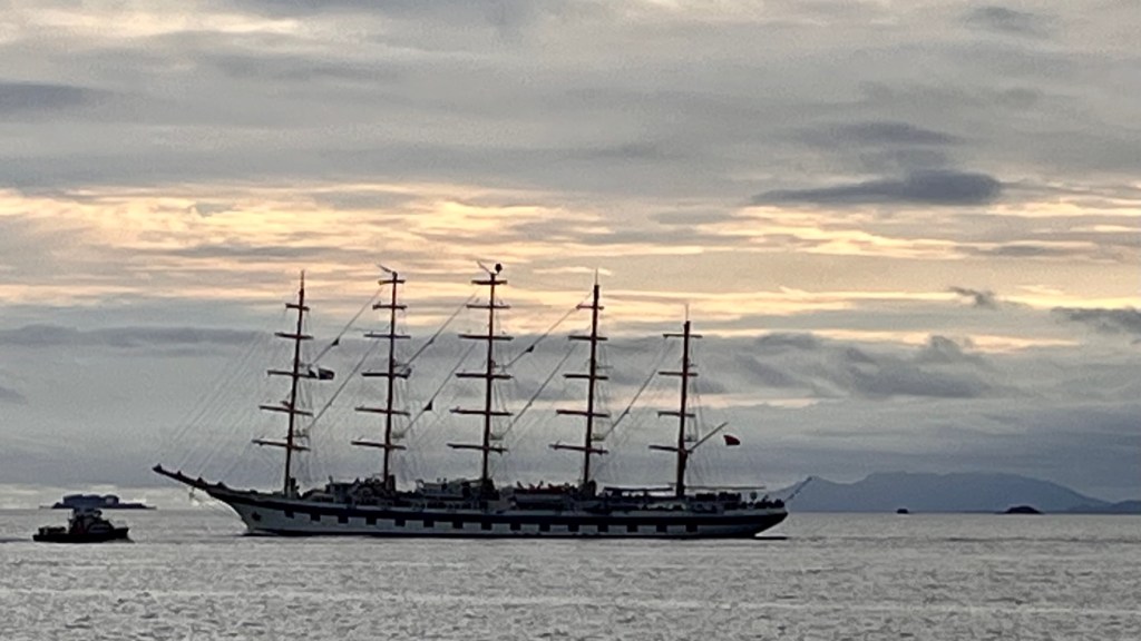 Das war aber noch nicht alles. Der Royal Clipper, ein 5-Master-Segelschiff für bis zu 227 Passagiere und ebenfalls Luxusausstattung. Leider kam er mit Maschine, statt unter Segeln aus dem Kanal, trotzdem ein eindrucksvolles Bild. Der Clipper kommt von Barbados und die Tour endet heute hier in Panama City.