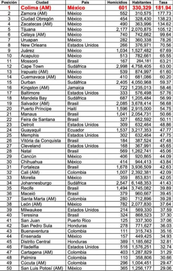Unter den 50 tödlichsten Städten sind 17 in Mexiko, 10 in Brasilien, 7 in den USA, 6 in Kolumbien und 4 in Südafrika. Die höchste Rate hat Colima MX mit 182 Morden auf 100.000 Einwohner. Auf Platz 50 sind es noch 29.