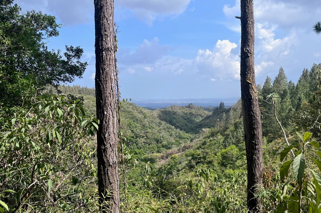 Als wir Cabuya Arriba erreicht haben, endet die Asphaltstraße. Hier befindet sich ein Trinkwasser-Schutzgebiet und es gibt eindrucksvolle Ausblicke in Richtung Pazifikküste und auf die Berge weiter westlich. Eine interessante Umgebung und wenn wir nicht so auf den Strand fixiert wären, könnte das hier eine angenehme Wohnlage sein.