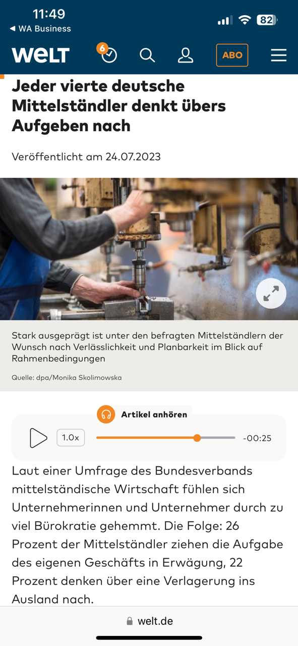 Das sagt die WELT unter Bezugnahme auf eine Umfrage des Bundesverbands der mittelständischen Wirtschaft. Ausserdem „denkt jeder vierte deutsche Mittelständler übers Aufgeben nach“.